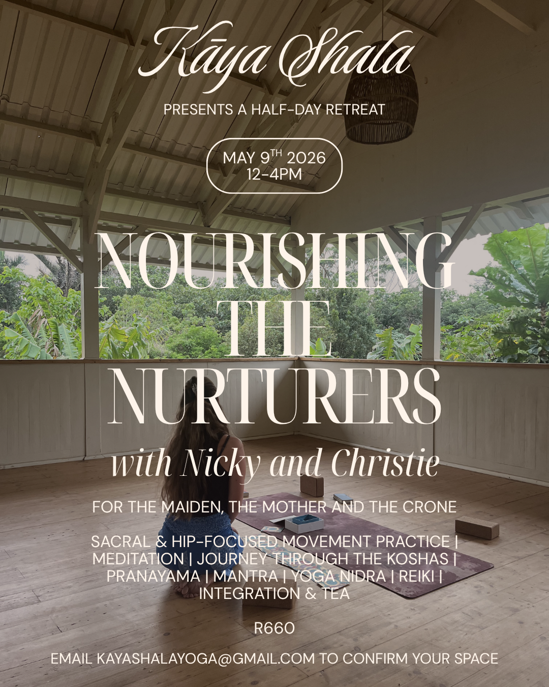 Guided by Nicky and Christie, the afternoon weaves together a rich tapestry of practices designed to soften the body and soothe the nervous system. Through sacral and hip-focused movement, breathwork, meditation, and a journey through the koshas, you’ll be gently guided inward. The experience is deepened with mantra, yoga nidra, and the subtle healing touch of Reiki, allowing for rest, integration, and renewal.