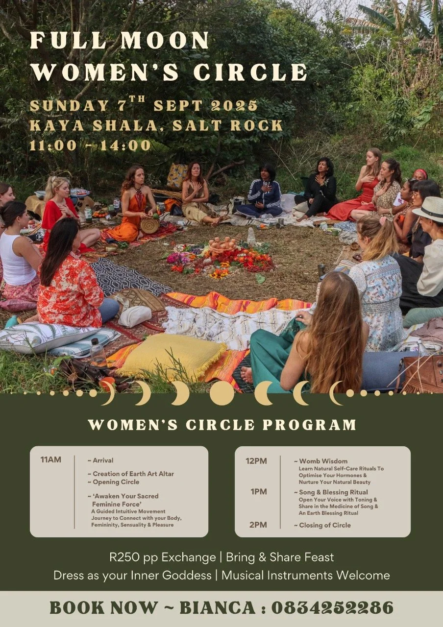 Full Moon Women's Circle with Bianca Sunday, September 7, 2025 11:00 AM 2:00 PM Kāya Shala Yoga Sheffield Beach Road Umhlali, KZN, 4390 South Africa (map) Google Calendar ICS